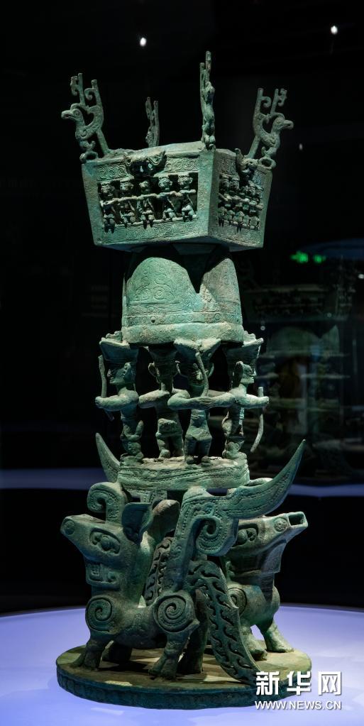 这是在位于四川省广汉市的三星堆博物馆拍摄的1986年出土于三星堆2号“祭祀坑”的青铜神坛(研究性复原件,3月5日摄)。该器可分为三层:底层是一对头尾相向的神兽;中层为四立人及头顶的山峰;上层有建筑及人物、飞鸟造型等,建筑额间有人首鸟身神像。其竖向垂直展开的时空序列表征天、地、人“三界”,生动形象地展现了古蜀人的神话宇宙观。新华社记者 沈伯韩 摄