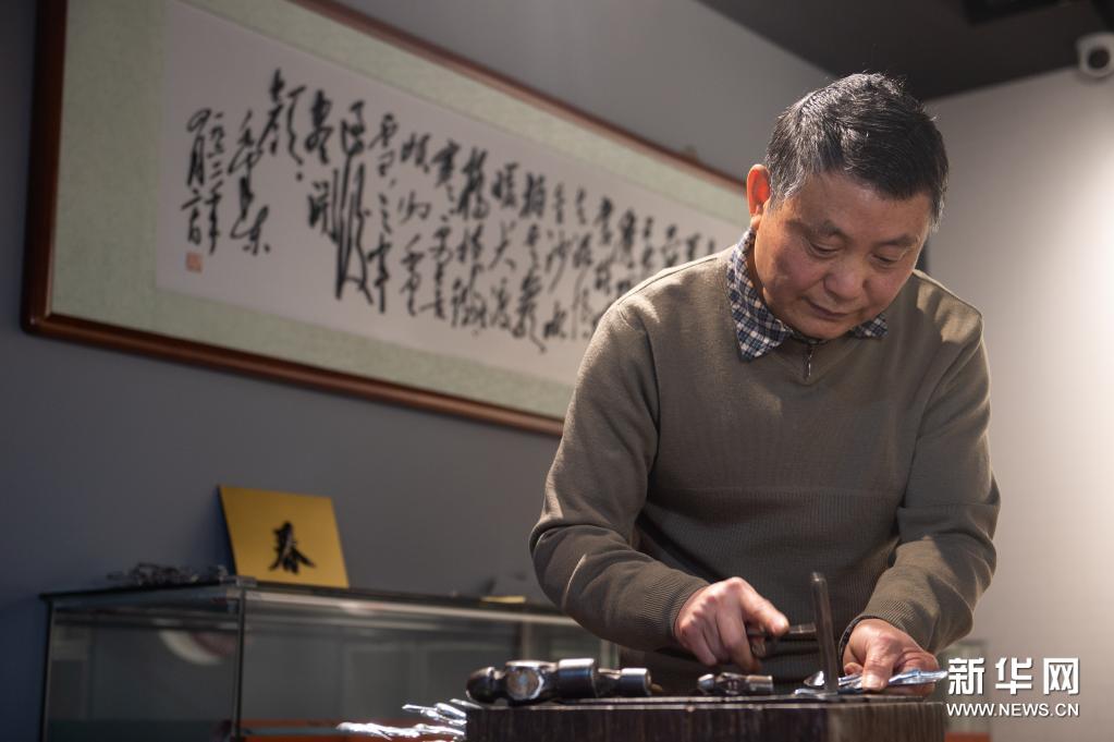 4月1日,在合肥市明光路街道非遗工作室,安徽省吴山铁字传承人郑书山在制作铁字作品“为人民服务”。新华社记者 杜宇 摄