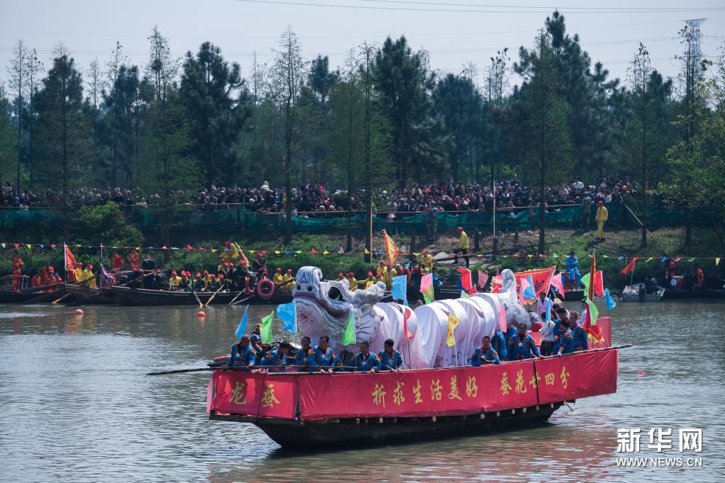 4月4日在“蚕花水会”现场拍摄的传统船只水上巡游。新华社记者 徐昱 摄