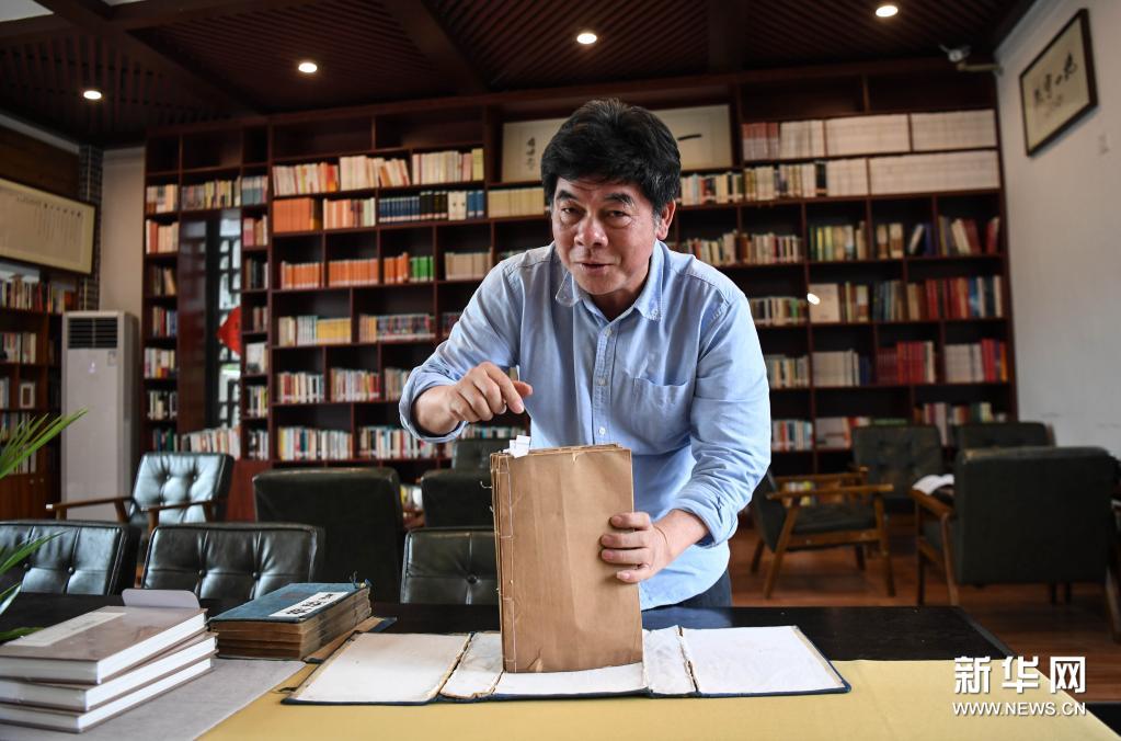 4月8日,在岛上书院,市民李国兴展示他捐赠的清代线装书。新华社记者 邓华 摄
