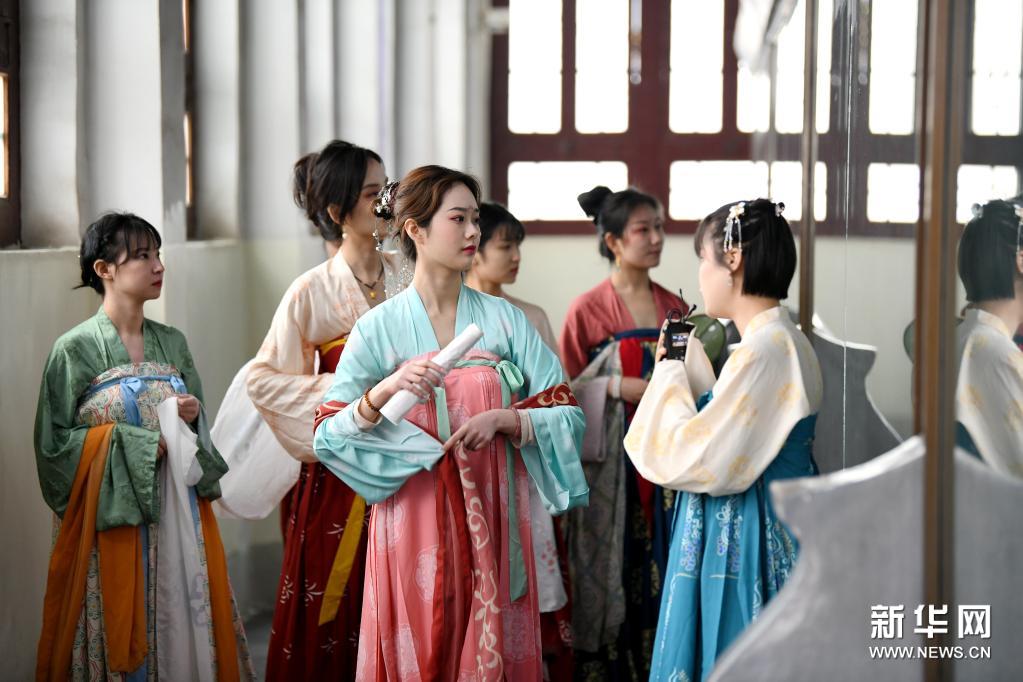 4月14日,参加上巳节雅集活动的汉服爱好者在西安碑林博物馆参观。新华社记者 李一博 摄