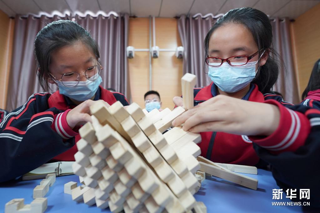 4月14日,河北省沙河市第四中学学生体验孔明锁。新华社记者 骆学峰 摄