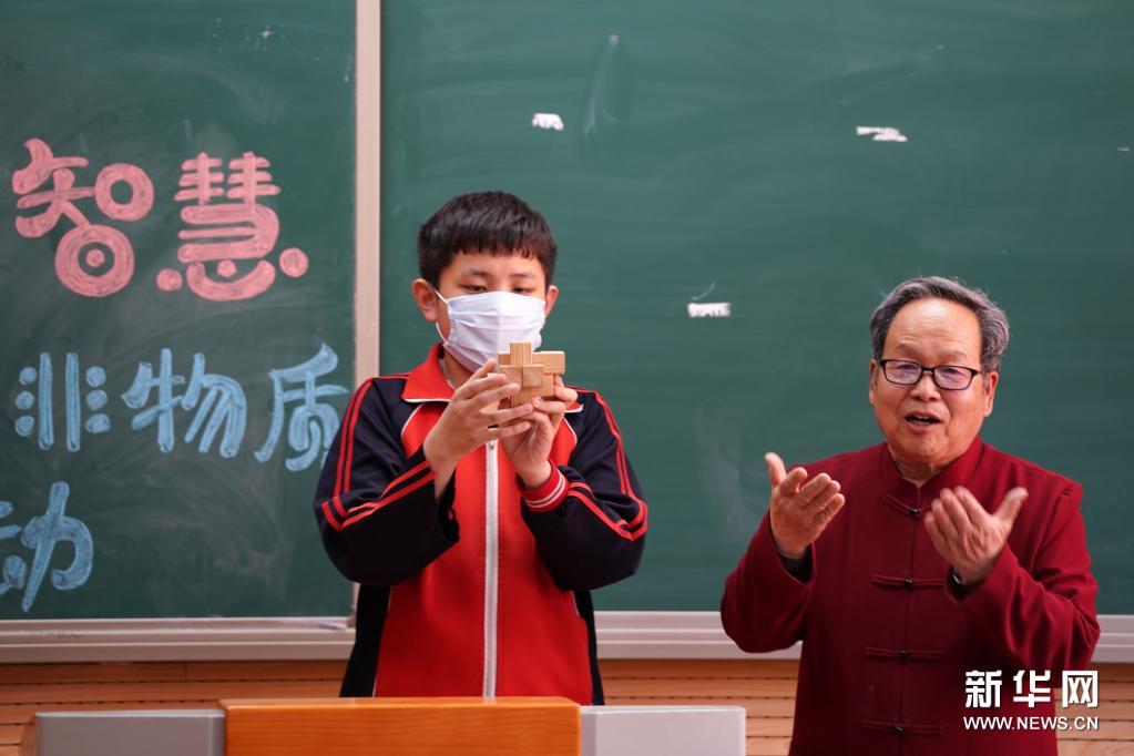 4月14日,河北省沙河市孔明锁制作艺人侯全辰为学生讲解孔明锁相关知识。新华社记者 骆学峰 摄