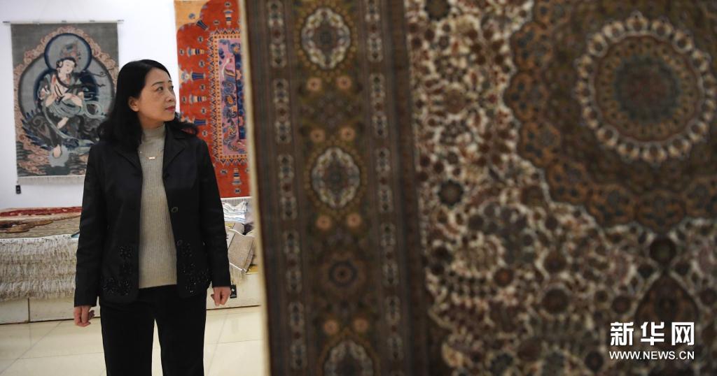 黄晶蓉从天水新天丝毯有限公司成品展室内走过(4月12日摄)。新华社记者 杜哲宇 摄