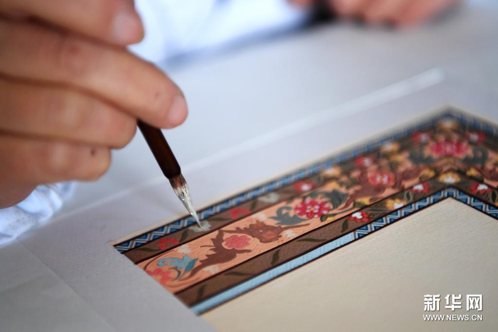 黄晶蓉在画板上给天水丝毯的设计小稿上色(4月12日摄)。新华社记者 杜哲宇 摄