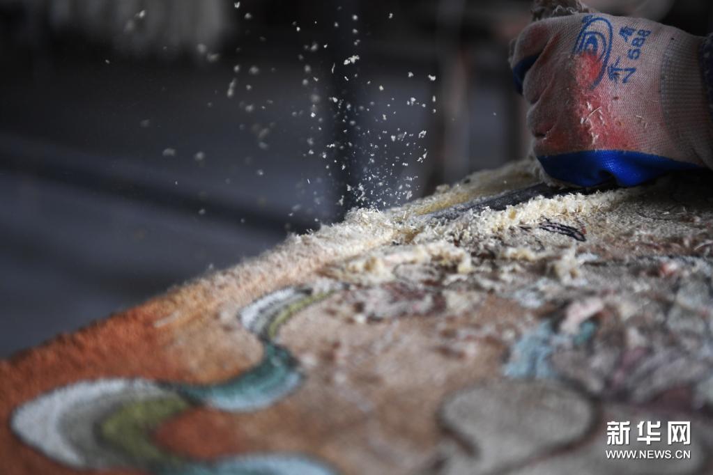 天水丝毯的织造工人进行丝毯的平整工作(4月12日摄)。新华社记者 陈斌 摄