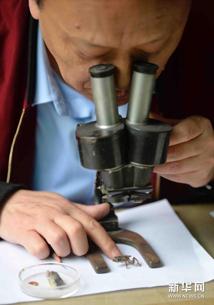 4月13日,李健在办公室用显微镜观察标本。新华社记者 刘坤 摄