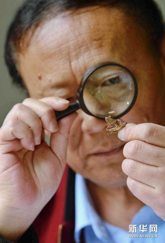 4月13日,李健在办公室用放大镜观察标本。新华社记者 刘坤 摄