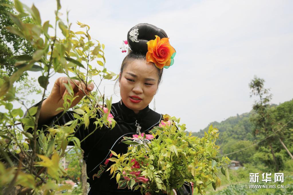 4月23日,台江县的苗家妇女在采摘用来制作五彩饭的树叶。新华社发(余天英 摄)