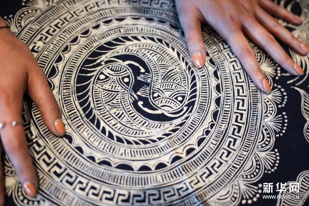 4月25日,王欣颖在蜡染体验店内查看制作完成的蜡染作品。新华社记者 欧东衢 摄