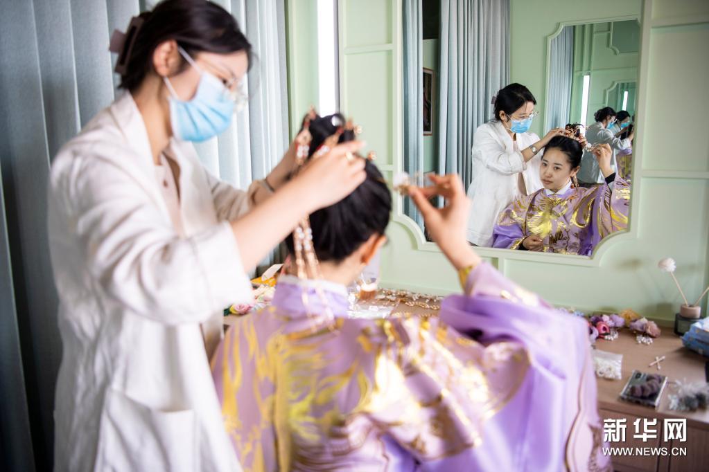 5月4日,在太原古县城的一家店铺内,游客化妆准备体验古风拍摄。新华社记者 杨晨光 摄