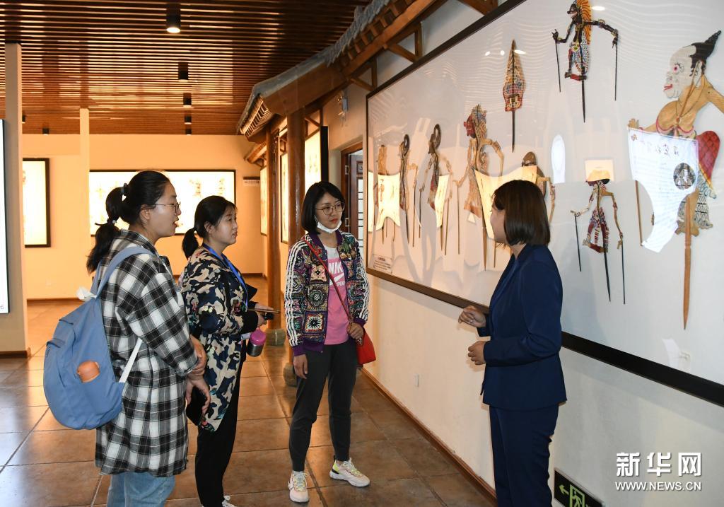 5月8日,陕西省渭南市华州区少华山国际皮影博览园讲解员(右一)向游客讲解皮影历史。新华社记者 王泽 摄