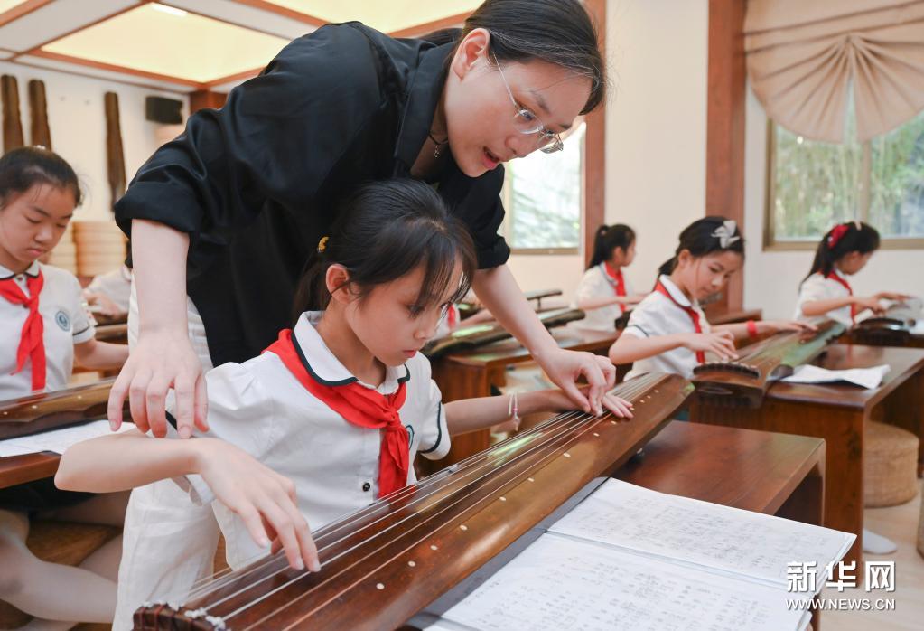 5月11日,在福州市乌山小学,课后古琴兴趣班的老师在指导学生练琴。