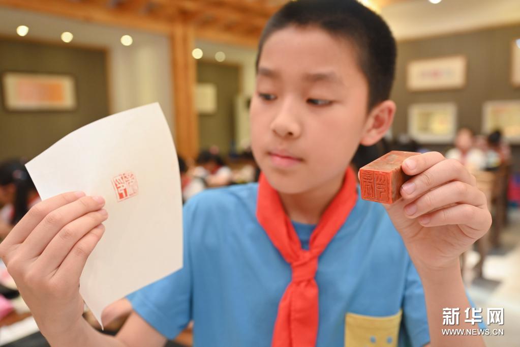 5月11日,在福州市乌山小学,篆刻兴趣班学生在展示篆刻作品。新华社记者 宋为伟 摄