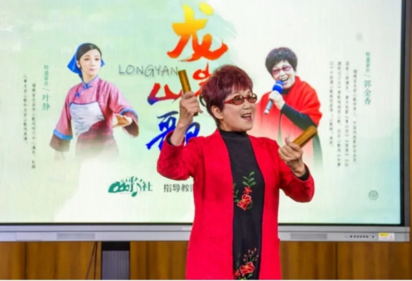 活动中,郭金香向同学们分享了她学习龙岩山歌的经历和她对龙岩山歌的理解,现场示范并教唱了《太阳出来红搭红》和《韭菜开花》。