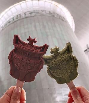 “伯矩鬲”文创雪糕有抹茶和巧克力两种口味。清雅苦涩的抹茶和浓郁醇厚的巧克力,它们与香甜的牛奶组合出广受欢迎的经典口味,同三千年前的“伯矩鬲”碰撞,令人回味无穷。