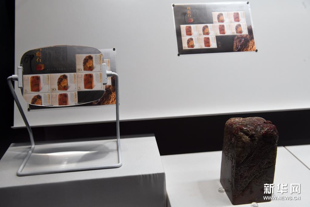 这是展出的“惟几惟康”宝玺(右下)与《鸡血石印》特种邮票(5月17日摄)。新华社记者 金良快 摄