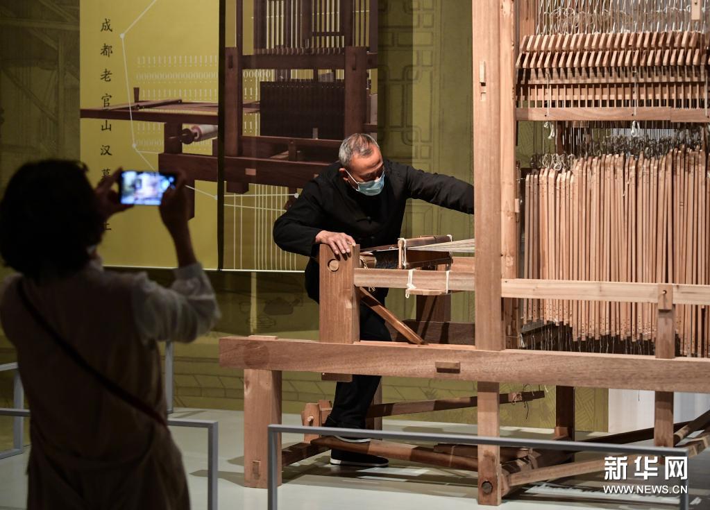 5月18日,来自中国丝绸博物馆的工作人员在展览现场使用成都老官山汉墓出土的提花机复原品展示汉代织造技艺。新华社记者 李贺 摄