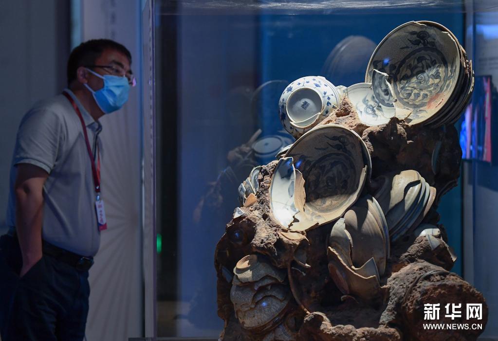 5月18日,参观者在展览现场观赏经过脱盐技术保护的南澳一号出水瓷器。新华社记者 李贺 摄