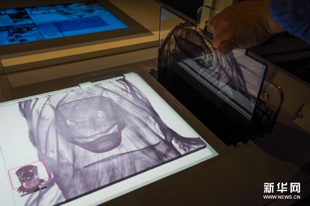 5月18日,观众在“万年永宝——中国馆藏文物保护成果展”上体验X光透视圆明园马首铜像。新华社记者 陈钟昊 摄