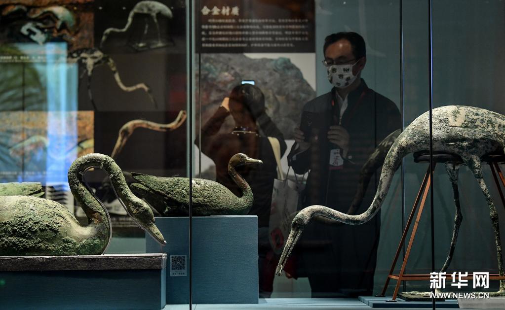 5月18日,参观者观赏一组经修复的秦始皇陵陪葬坑出土的彩绘青铜水禽。新华社记者 李贺 摄