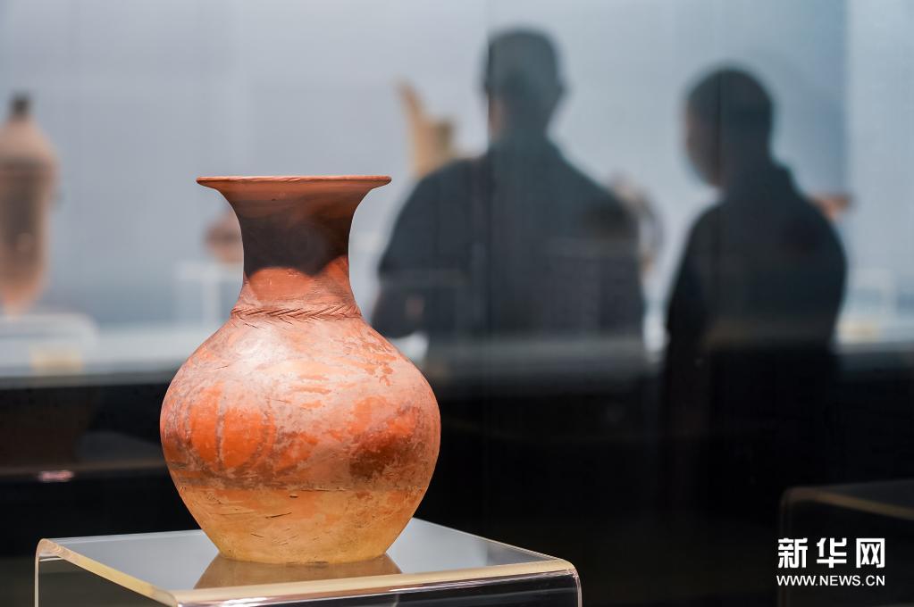 5月18日在上海博物馆中国古代陶瓷馆拍摄的马家窑文化彩陶鸟纹壶。新华社记者 王翔 摄