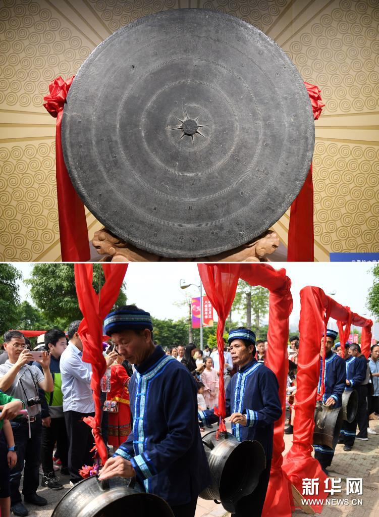 拼版照片:上图为广西民族博物馆展示的一面壮族铜鼓(5月18日摄);下图为在广西民族博物馆,几名男子敲打壮族铜鼓表演节目(2018年4月18日摄)。新华社记者 陆波岸 摄