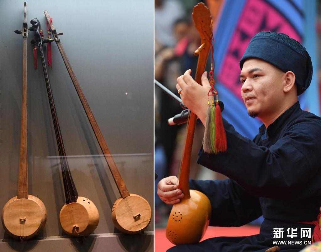 拼版照片:左图为广西民族博物馆展示的壮族天琴(5月18日摄);右图为在广西南宁市三街两巷,一名天琴艺人在壮族天琴艺术展演中表演(4月16日摄)。新华社记者 陆波岸 摄