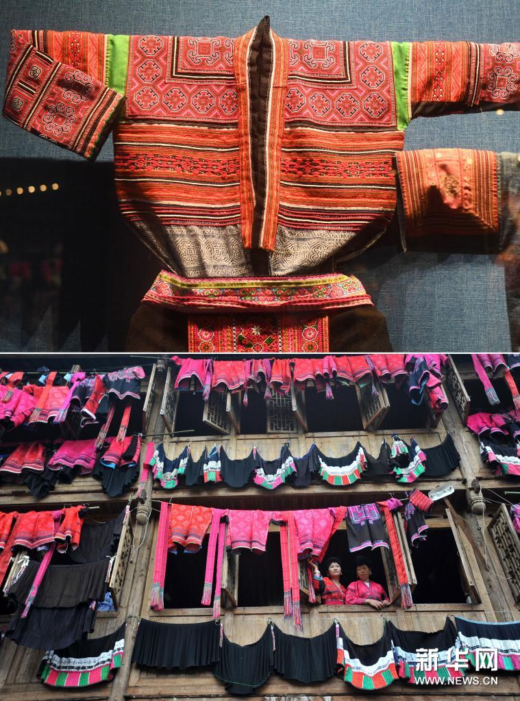拼版照片:上图为广西民族博物馆展示的一件红瑶服饰(5月18日摄);下图为在广西龙胜各族自治县龙脊镇金坑瑶寨,当地瑶族同胞在红瑶“晒衣节”上晾晒的瑶族服饰(2014年7月2日摄)。新华社记者 陆波岸 摄