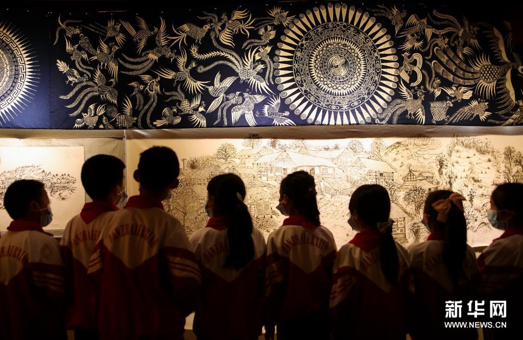 5月18日,小学生在贵州丹寨县民俗博物馆参观苗族蜡染制品。新华社发(黄晓海 摄)
