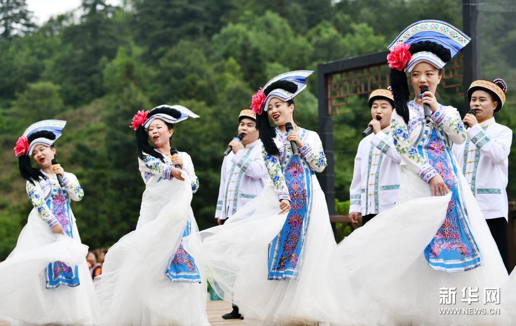 5月19日,在贵州省龙里县谷脚镇茶香村,少数民族同胞参加庆祝活动。当日是农历四月初八,贵州省黔南布依族苗族自治州龙里县在谷脚镇茶香村举办第七届十里刺梨沟赏花旅游文化节,欢庆“四月八”传统节日。新华社记者 杨文斌 摄