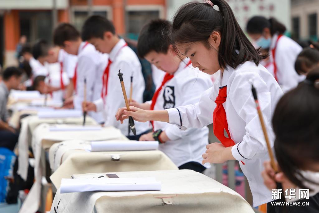 5月19日,小学生在进行书法展示。当日,“颂百年风华·育时代新人”贵阳市云岩区百名小学生现场书法展示活动在贵阳市第四实验小学举办,小学生们现场进行书法展示,书写内容以庆祝建党100周年和积极向上的相关名人名言为主。新华社记者 刘续 摄