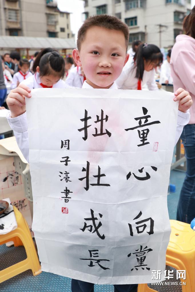 5月19日,小学生在展示自己的书法作品。新华社记者 刘续 摄