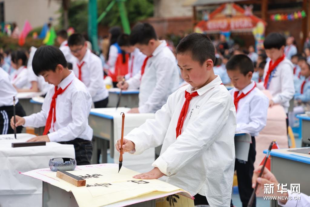 5月19日,小学生在进行书法展示。新华社记者 刘续 摄