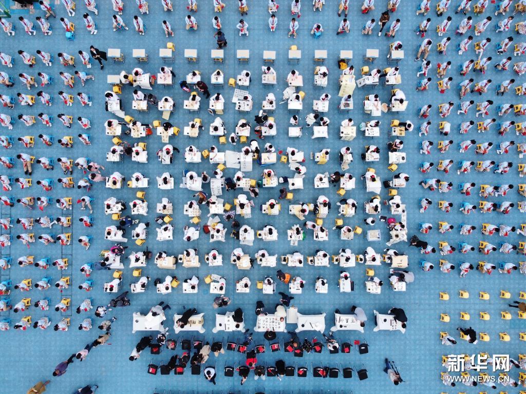 5月19日,小学生在现场进行书法展示(无人机照片)。新华社记者 刘续 摄