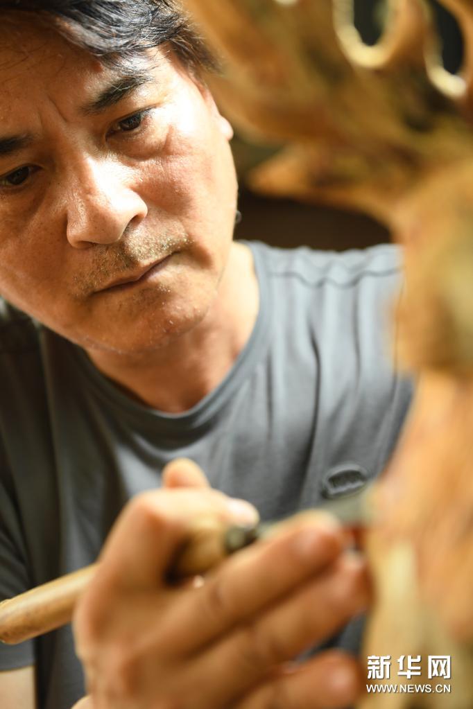 浙江杭州建德市下涯镇下涯村村民徐惠东,自幼患小儿麻痹症,利用勤劳的双手开创出自己的木雕天地。徐惠东19岁跟随东阳木雕师傅学习,后来前往厦门工作十多年,从家具浮雕逐渐转到根雕创作。2006年,徐惠东回乡开设工作室,并带领当地有志手工艺的青年进行创业,他也陆续获得了杭州市民间工艺大师、杭州自强工匠等称号。立足乡土,徐惠东说这些年自己的创作“越来越放得开”,也希望带动更多人追寻梦想。