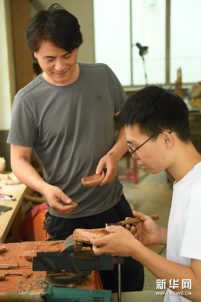5月24日,徐惠东(左)在位于下涯村的工作室指导徒弟洪明进行茶则制作。新华社记者 翁忻旸 摄