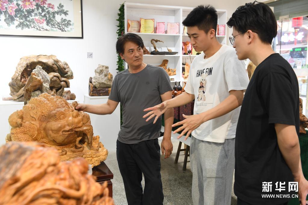 5月24日,徐惠东(左)在位于建德市梅城镇的展厅向来自上海的游客介绍木雕作品。新华社记者 翁忻旸 摄