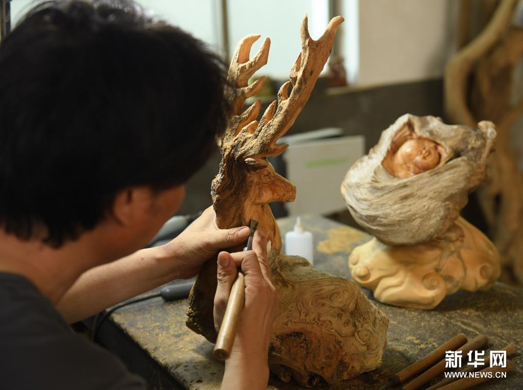 5月24日,徐惠东在位于下涯村的工作室进行木雕创作。新华社记者 翁忻旸 摄
