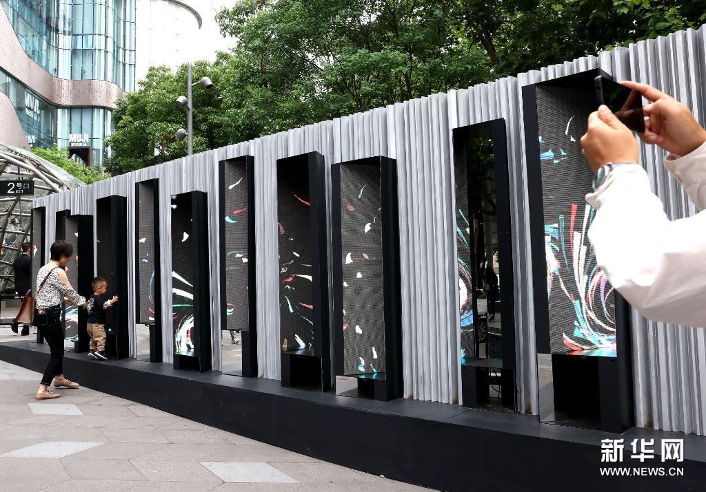5月28日,游客在上海新天地“幻彩屏风”艺术装置前游玩。新华社记者 陈飞 摄