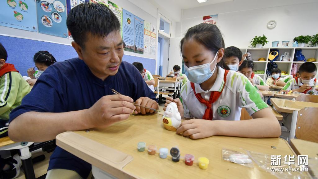5月31日,北京泥彩塑代表性传承人张忠强(左)为学生讲解兔儿爷的制作和着色技艺。新华社记者 李欣 摄