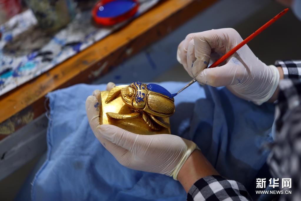 5月25日,在位于埃及盖卢比尤省的科努兹埃及文物复制品工厂,工作人员给一尊圣甲虫雕塑复制品上色。这家工厂主要制作埃及历史上具有重要艺术和历史价值的文物的复制品。新华社发(艾哈迈德·戈马 摄)