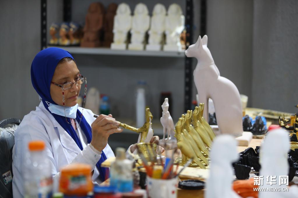 5月25日,工作人员在位于埃及盖卢比尤省的科努兹埃及文物复制品工厂给古埃及鹰神荷鲁斯的雕塑复制品上色。新华社发(艾哈迈德·戈马 摄)