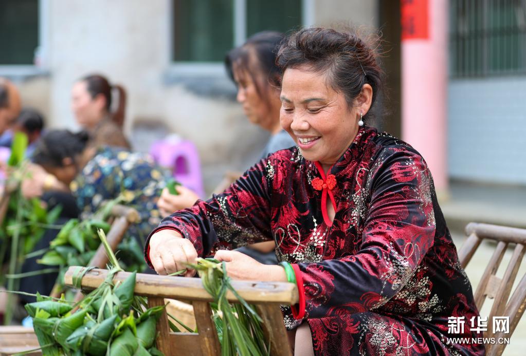 6月2日,贵州省铜仁市玉屏侗族自治县亚鱼乡郭家湾村村民参加包粽子比赛。新华社发(胡攀学摄)