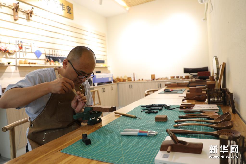 6月9日,在行唐县小董工坊枣木工艺馆,工作人员制作枣木工艺品。近年来,河北省石家庄市行唐县依托丰富的枣木资源,开发枣木工艺品,打造出枣木根雕、枣木笔筒、枣木茶具等50余个品种的枣木制品,通过线上、线下等渠道销往国内外,成为当地的一项富民产业。新华社记者 骆学峰 摄