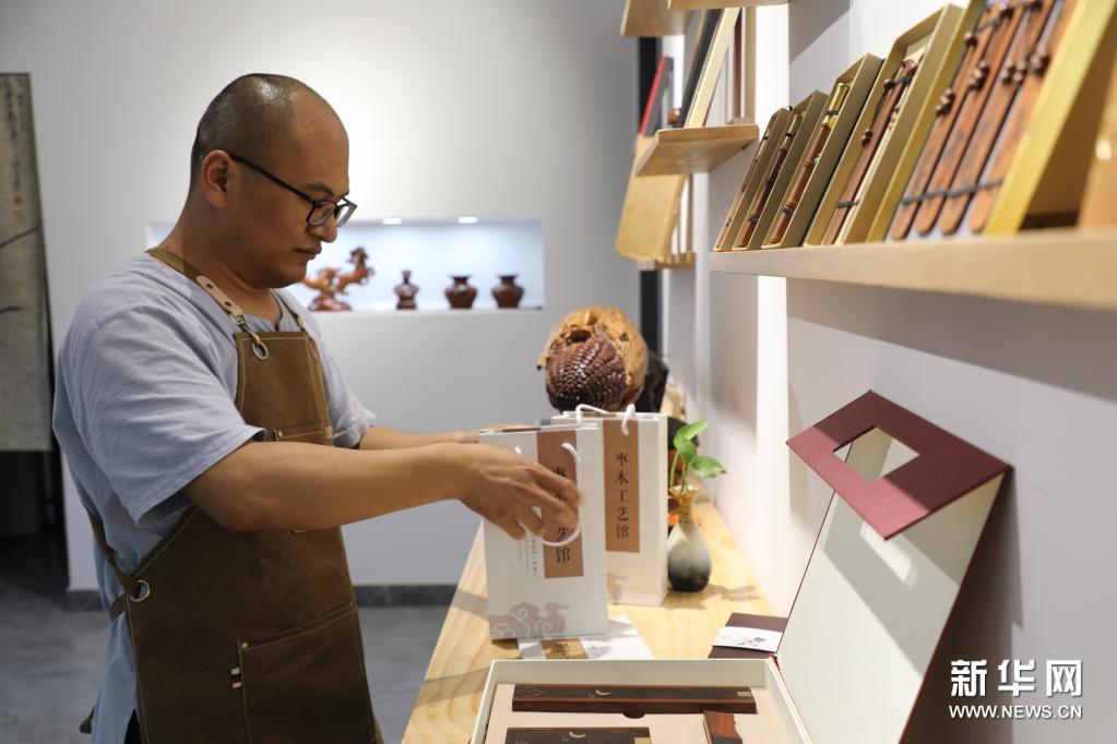 6月9日,在行唐县小董工坊枣木工艺馆,工作人员打包枣木工艺品。新华社记者 骆学峰 摄