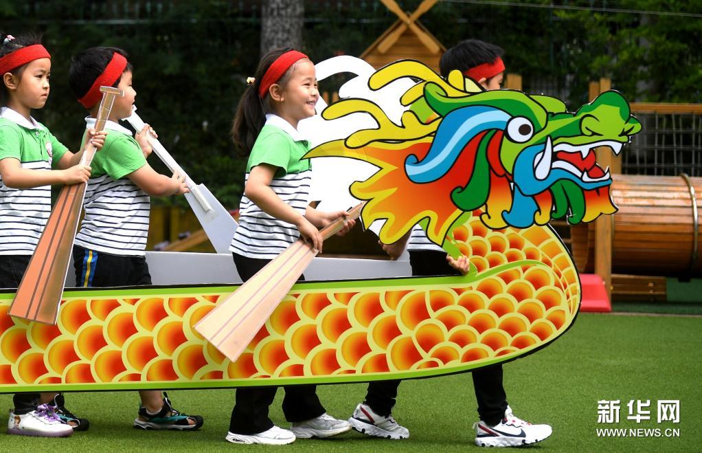 6月10日,石家庄市桥西区第三幼儿园的小朋友们在进行划“龙舟”比赛。端午佳节将至,河北省石家庄市桥西区第三幼儿园开展“品民俗 迎端午”主题活动,通过划“龙舟”、巧手制作小香包、包粽子等形式,让孩子们感受传统民俗的魅力。新华社记者 王晓 摄