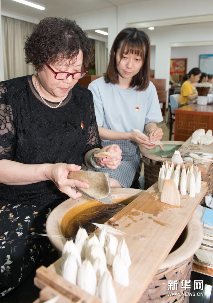 6月10日,在位于湖州爱山街道的王一品斋笔庄制笔车间,61岁的徐子敏(左)向年轻制笔师黄丹示范笔毛梳理流程。新华社记者 翁忻旸 摄