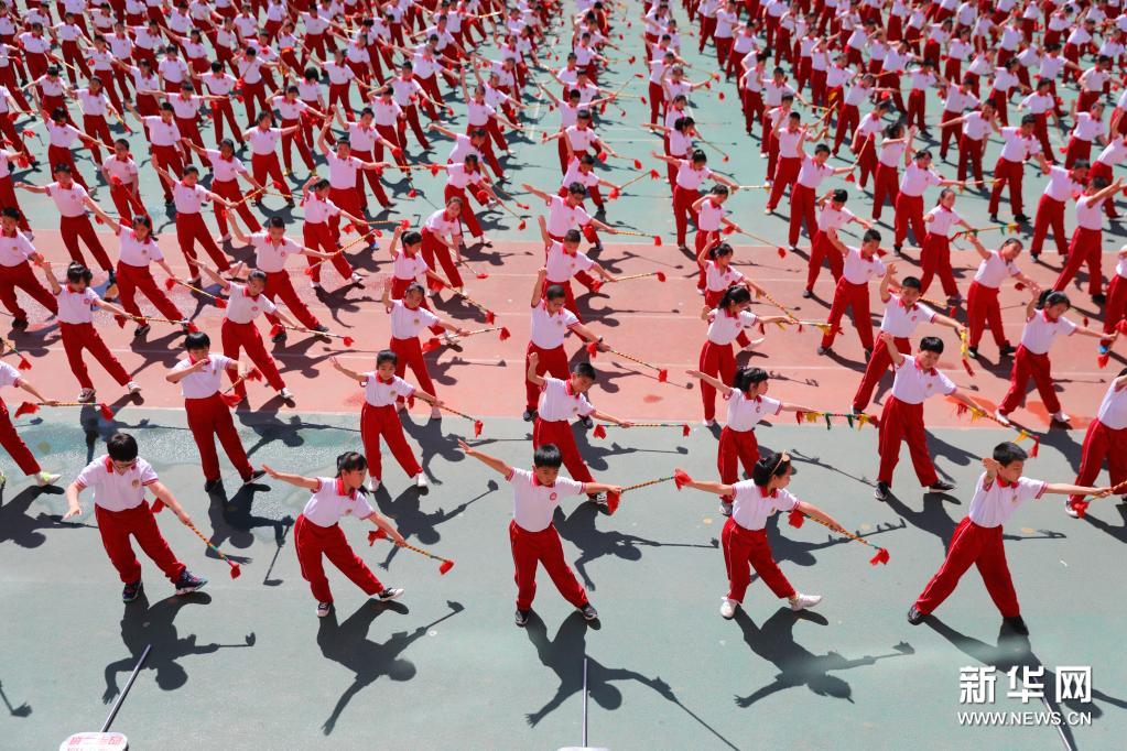6月10日,在承德市双桥区南营子小学,学生在大课间上练习“霸王鞭”。新华社发(刘环宇 摄)
