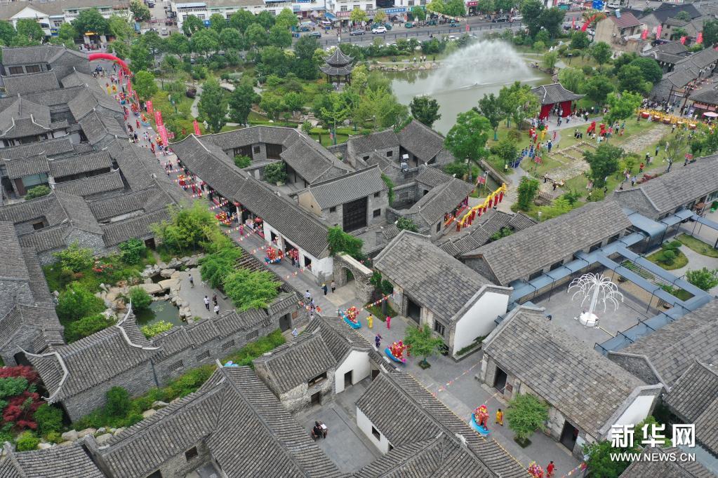 6月13日,市民和游人在盱眙县第一山历史文化街区观看民俗表演(无人机照片)。当日,市民和游客在江苏省淮安市盱眙县第一山历史文化街区看展演、赏民俗,体验端午文化。近年来,盱眙县对第一山历史文化街区进行保护和修缮,再现历史风貌,传承地域非遗文化。新华社记者 季春鹏 摄